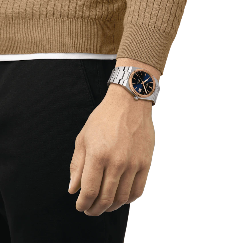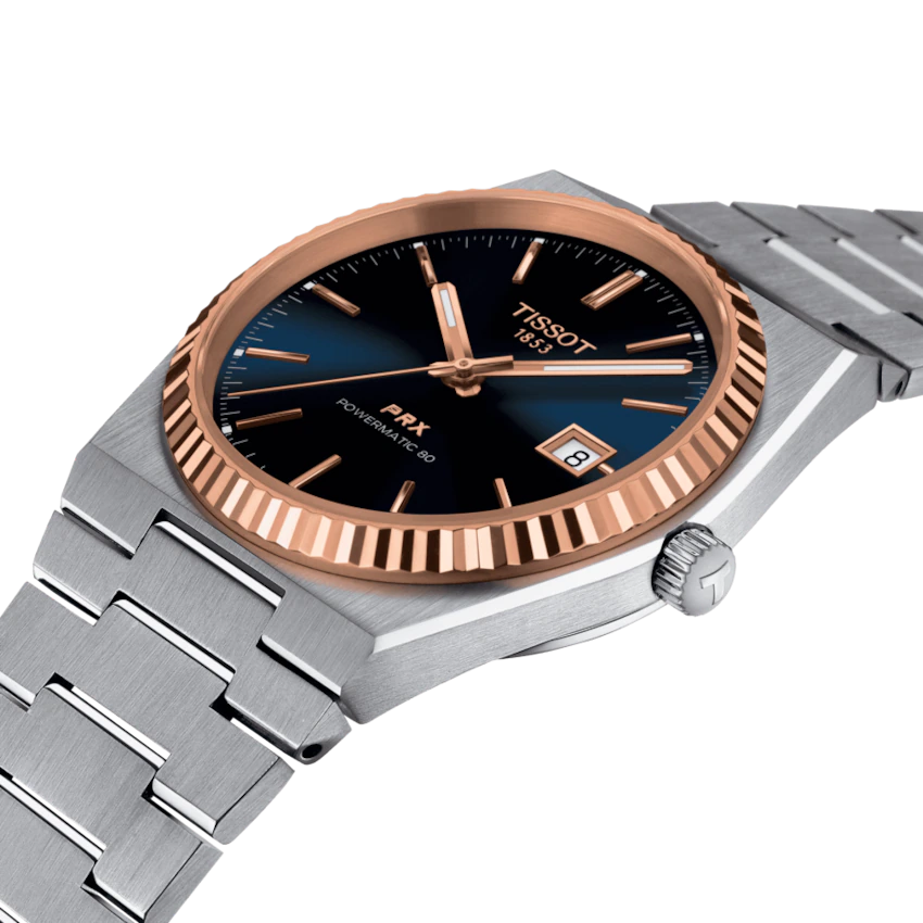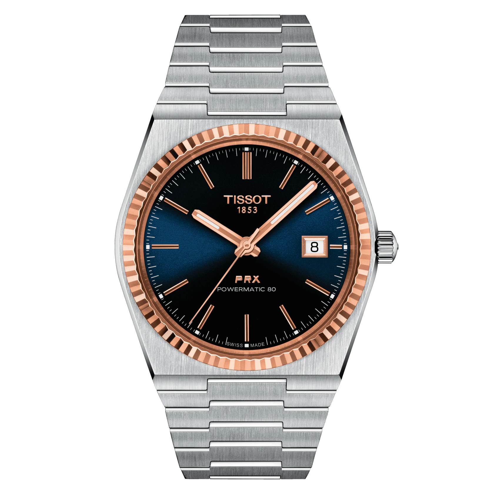 Seria Tissot PRX to nowa edycja kultowego, wyjątkowego modelu z lat siedemdziesiątych ubiegłego wieku. W idealny sposób łączy ducha przeszłości z nowoczesnością. Model oferowany jest w trzech wersjach kolorystycznych na pięknej stalowej bransolecie. Wewnątrz 40 mm koperty pracuje niezawodny, mechanizm POWERMATIC 80.111. Całości dopełnia odporne na zarysowania szkło szafirowe. Czasomierz objęty jest dwuletnią, międzynarodową gwarancją producenta. Antymagnetyczna sprężyna Nivachron. Bezel wykonany z 18 K złota.