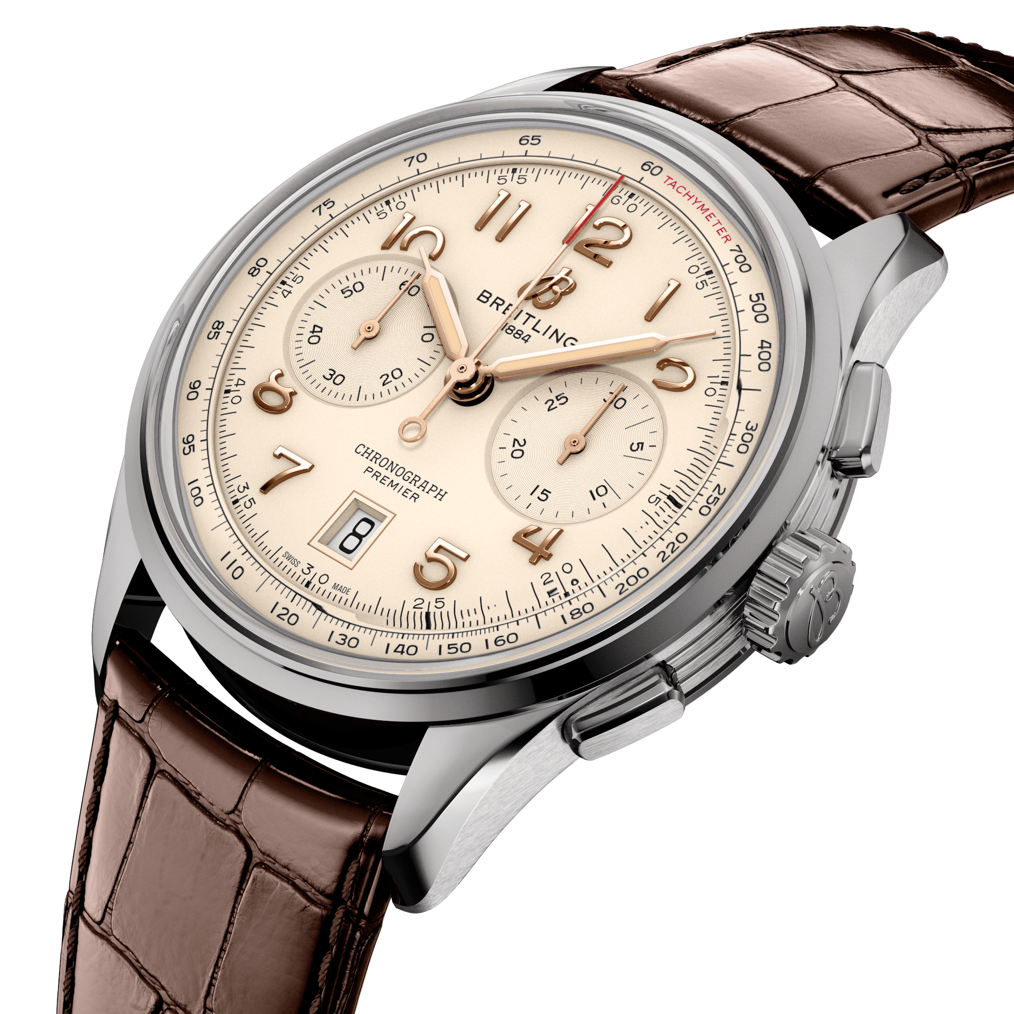 Na początku lat czterdziestych Willy Breitling marzył już o czasie po wojnie, kiedy użyteczność ustąpi miejsca nieokiełznanemu optymizmowi. Zaczął projektować chronograf, który byłby funkcjonalny, ale także niezaprzeczalnie elegancki i nieskończenie wygodny w noszeniu – jego zdaniem „niewątpliwy znak nienagannego smaku”. Nazwał tę nową linię Premier. Aby stworzyć nowoczesny model Premier, Breitling zachował charakterystyczne detale w stylu vintage. Czasomierz posiada charakterystyczne opływowe, przyciski obsługujące chronograf. Model Premier B01 Chronograph 42 jest dostępny z szeroką gamą kolorów tarczy i materiałów, z których wykonana jest koperta. Do wyboru jest klasyczny pasek ze skóry aligatora lub elegancka metalowa bransoleta z 7 rzędami. Dzisiejszy Premier również spełnia bezkompromisowe standardy techniczne Willy'ego Breitlinga dzięki wyjątkowemu samozwijającemu się mechanizmowi — certyfikowanemu przez COSC kaliberowi produkcji Breitling 01 — zaprojektowanemu z myślą o maksymalnej precyzji, niezawodności i funkcjonalności. Premier B01 Chronograph 42mm objęty jest pięcioletnią, międzynarodową gwarancją producenta.