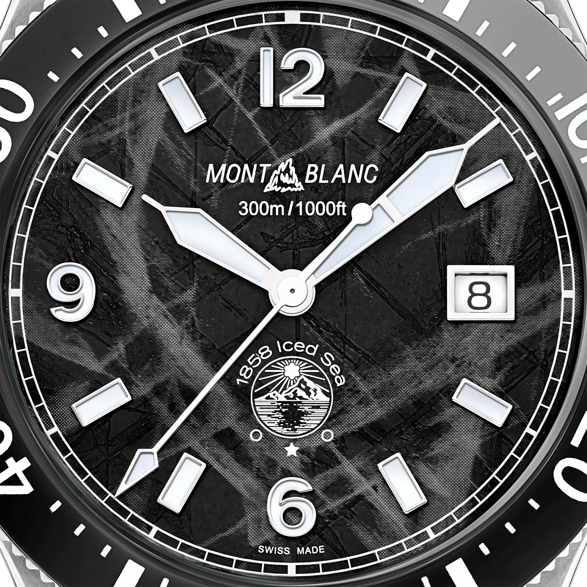 Montblanc 1858 Iced Sea Automatic Date, pierwszy w historii sportowy zegarek do nurkowania firmy Montblanc, ma tarczę ze wzorem lodowca, która sprawia wrażenie, jakby ktoś zaglądał w głąb lodowca. Ta czarna tarcza ze wzorem lodowcowym inspirowana jest Mer de Glace – Morzem Lodu – głównym lodowcem masywu Mont- Blanc. Jego teksturę uzyskano za pomocą prawie zapomnianej techniki przodków zwanej gratté-boisé. Zegarek jest wyposażony w jednokierunkową dwukolorową ceramiczną ramkę, grawerowany dekiel i zwężającą się wymienną bransoletę ze stali nierdzewnej z precyzyjną regulacją zapewniającą precyzyjne dopasowanie. Zegarek jest zgodny z normą ISO 6425 dotyczącą zegarków nurkowych i jest wodoodporny do 300 metrów. Czarny kolor tarczy odnosi się do lodu, który kiedy pozbawiony jest pęcherzyków powietrza sprawia wrażenie jakby pochłaniał światło. Zegarek ten charakteryzuje się eleganckim designem i wysoką jakością wykonania. Został stworzony z myślą o mężczyznach, którzy cenią sobie klasykę, elegancję oraz precyzję. Posiada on okrągłą kopertę wykonaną ze stali nierdzewnej o średnicy 41 mm. Na tarczy zegarka umieszczone są wskaźniki godzin w formie klasycznych indeksów oraz wskazówki w kształcie strzałek, co zapewnia wygodne odczytywanie czasu. Całość została osłonięta przez wytrzymałe szkło szafirowe, które skutecznie chroni zegarek przed zarysowaniami i uszkodzeniami. Jest napędzany za pomocą automatycznego mechanizmu zegarkowego, co oznacza, że zegarek samodzielnie nabiera energię kinetyczną z ruchu ręki użytkownika, eliminując potrzebę regularnego nakręcania. Posiada on również funkcję datownika, która umożliwia wyświetlanie bieżącej daty na tarczy zegarka. Pasek został wykonany z solidnej stali nierdzewnej. Możliwość regulacji paska pozwala na dopasowanie zegarka do indywidualnego rozmiaru nadgarstka. Jest to zegarek, który idealnie nadaje się zarówno na codzienne noszenie, jak i na bardziej formalne okazje. Jego minimalistyczny design sprawia, że jest to klasyka, która nie wyjdzie z mody. To wyraz luksusu, elegancji oraz precyzji.